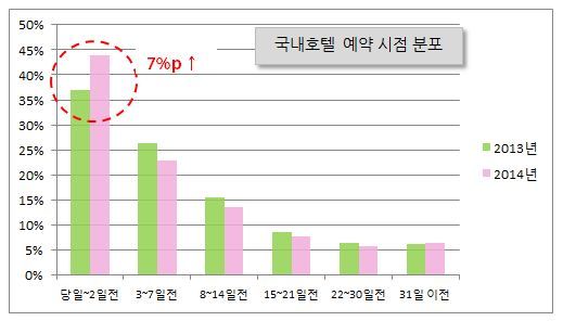 체크인 당일~이틀 이내 예약 비중, 2013년 37%에서 2014년 44%로 증가