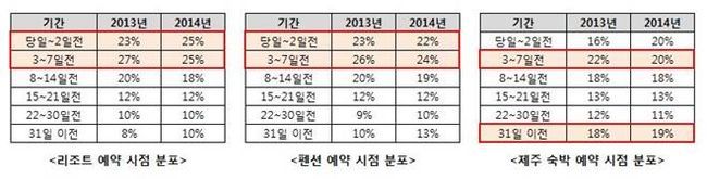 인터파크투어에 따르면 국내 숙박 상품군은 호텔과 리조트, 펜션으로 나눴으며, 여러 숙박업체가 밀집돼 있는 관광 특구 제주도는 별도의 항목으로 분석했다. 먼저 2014년 호텔의 경우 체크인 기준으로 당일에서 2일전 예약 비중이 44%로 가장 높았고 3일~7일전(23%), 8일~14일전(13%) 순으로 나타났다.
