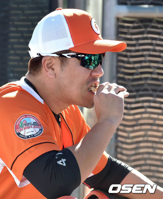 신소연 기상캐스터와 열애설이 터진 강민호가 훈련중 간식을 먹고 있다./spjj@osen.co.kr