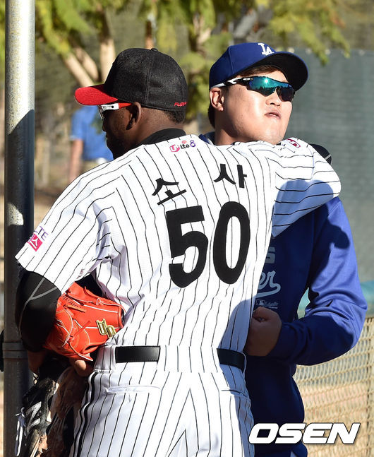 22일(현지시간) 연봉 협상이 늦어져 애리조나 스프링캠프에 지각 합류한 봉중근이 첫 훈련을 가졌다. 소사가 류현진과 포옹을 하고 있다.