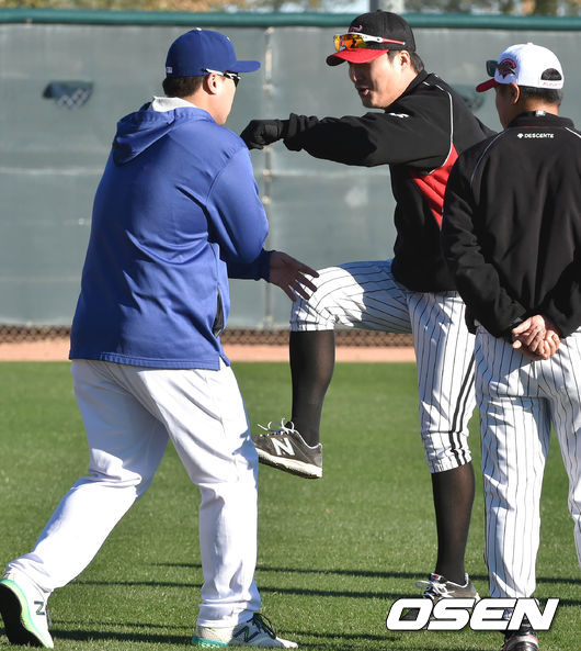 22일(현지시간) 연봉 협상이 늦어져 애리조나 스프링캠프에 지각 합류한 봉중근이 첫 훈련을 가졌다. 이진영과 류현진이 장난을 치고 있다.