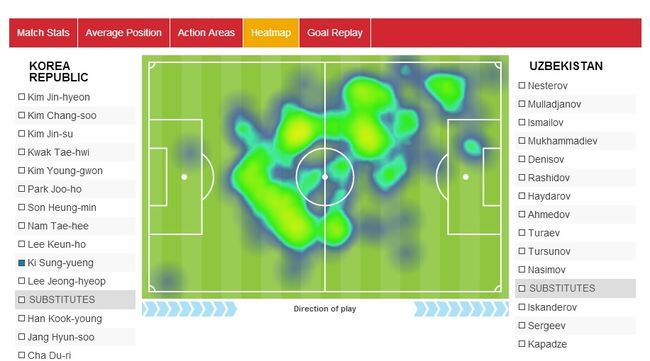 기성용은 주장 완장의 무게 만큼이나 쉴 새 없이 뛰었다. 연장까지 120분 풀타임을 소화했다. 만능키였다. 중앙 미드필더로 뛰다 2선으로 올라가 공격형 미드필더와 측면 날개를 소화했다. 기성용의 우즈벡전 히트맵을 보더라도 미드필드와 2선의 중앙, 좌측면 등 전지역을 누볐던 것을 알 수 있다.
