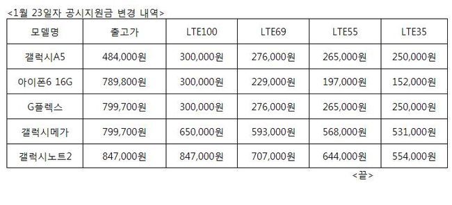지원금을 확대한 4개 단말에 대해서도 아이폰6는 최대 30만 원(LTE100기준), 갤럭시노트2는 최대 84만 7000원(상동), 갤럭시 메가는 최대 65만 원(상동), G플렉스는 최대 25만 원(LTE35기준)으로 각각 지원금을 상향했다.