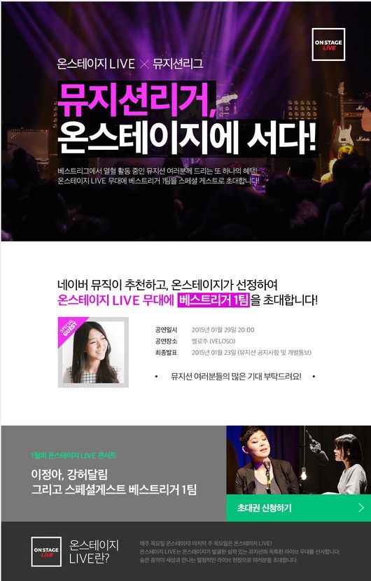 뮤지션리그와 온스테이지가 만난 이번 콜라보레이션은 관객과의 소통이 절실한 뮤지션에게 대중을 만날 수 있는 무대를 정기적으로 제공하자는 취지로 기획됐다. 베스트리그에 속한 뮤지션 중 네이버 뮤직이 추천하고, 네이버문화재단이 최종 선정한 1팀은 ‘온스테이지 LIVE’ 무대에 서게 된다. 온스테이지는 2010년부터 뮤지션과 관객과의 만남을 위해 라이브 무대를 꾸준히 지원해 왔으며 이를 ‘온스테이지 LIVE’로 확장해 올해부터 매달 마지막 목요일마다 뮤지션에게 라이브 무대를 지원할 예정이다.