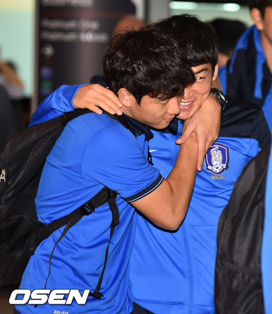 결국 슈틸리케호는 결전지 시드니에는 2시 30분이 다 되서야 도착하게 됐다. 비행기 회항으로 시드니 공항에 늦게 도착한 남태희와 김민우가 포옹을 하고 있다. / rumi@osen.co.kr