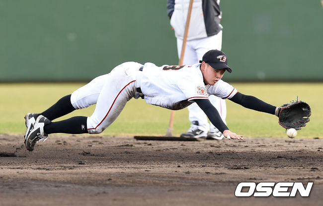 한화 이도윤이 수비 훈련을 하고 있다.