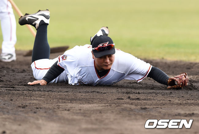 한화 김태균이 수비 훈련을 하고 있다.