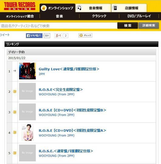 22일차 일본 터워레코드 예약차트에 2PM의 9집 싱글 '길티 러브(Guilty Love)'가 1위에 올랐다.