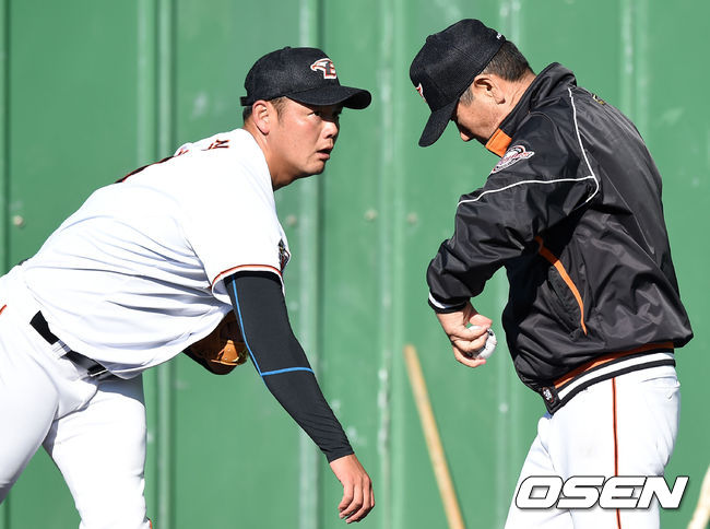 한화 김성근 감독이 송창식을 지도하고 있다.