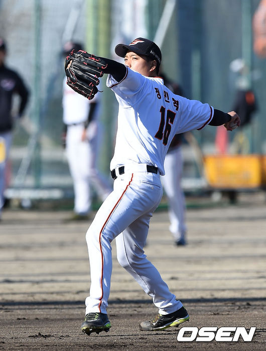 한화 정민혁이 캐치볼 훈련을 하고 있다.