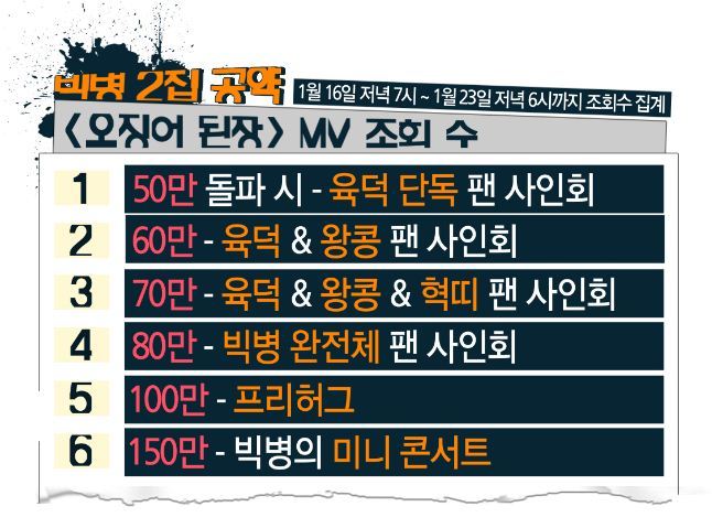 빅병은 일주일간 뮤직 비디오 조회수가 50만 이상이면 멤버 육덕(육성재)의 팬사인회, 60만이 넘어서면 육덕(육성재)+왕콩(잭슨)의 팬사인회를 약속한 바 있다.