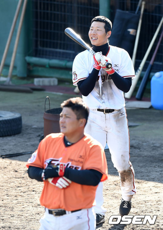 한화 권용관과 김태균이 타격 훈련 중 미소를 짓고 있다.