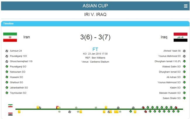 이라크 축구대표팀은 23일(이하 한국시간) 호주 캔버라 스타디움서 열린 2015 아시아축구연맹(AFC) 아시안컵 이란과 8강전에서 3-3으로 비긴 후 승부차기에서 7-6으로 승리를 거뒀다.