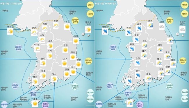 23일 기상청에 따르면 이번 주말은 고기압 가장자리에 들어 가끔 구름많겠으나, 일요일 오후에 중부지방과 전라도에 비가 시작되겠다.
