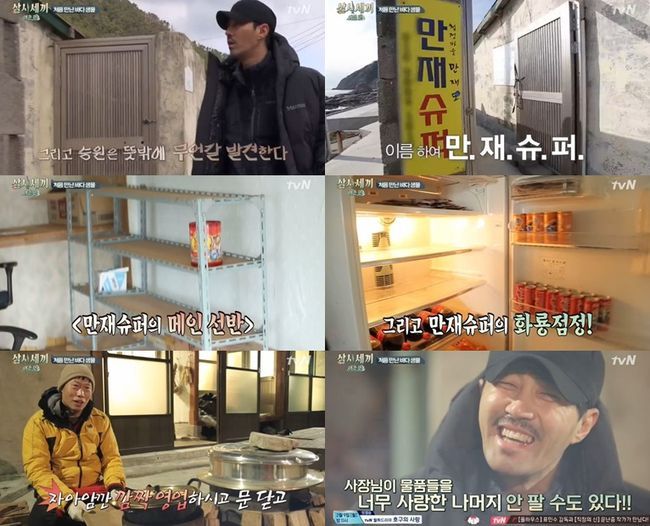 23일 오후 첫 방송된 tvN '삼시세끼-어촌편'(연출 나영석 신효정)에서 차승원은 물고기를 잡으러 가던 길에 만재도의 유일한 슈퍼인 '만재 슈퍼'를 발견한다.