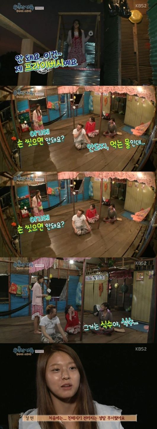 이날 설현이 수상가옥의 오픈형 화장실 사용에 도전했다. 설현은 화장실에 갈 엄두가 나지 않아 하루 종일 물을 먹지 않고 버텼지만, 밤이 돼 결국 화장실을 사용해야했다.
