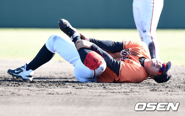 한화 김태균이 수비 훈련 중 타구를 맞고 고통스러워하고 있다.