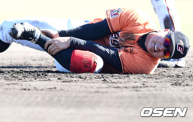 한화 김태균이 수비 훈련 중 타구를 맞고 고통스러워하고 있다.