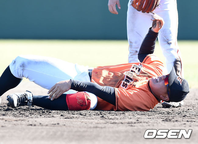 한화 김태균이 수비 훈련 중 타구를 맞고 고통스러워하고 있다.