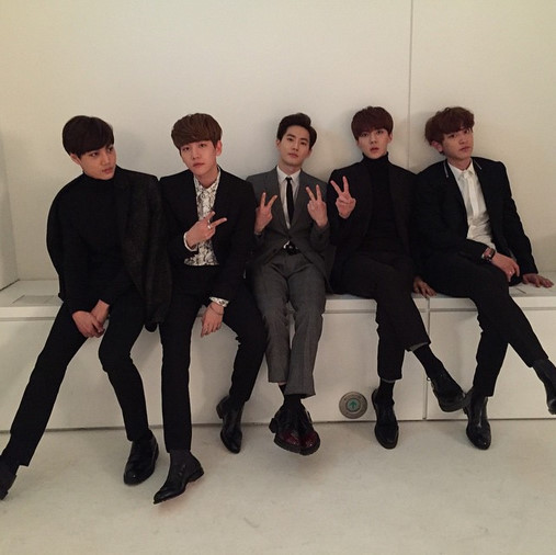 공개된 사진 속에는 나란히 벽에 기대어 앉은 카이, 백현, 수호, 세훈, 찬열의 모습이 담겨있다. 특히 이들은 모두 단정한 슈트 차림으로 모델 못지않은 비율과 훈훈한 비주얼로 보는 이들의 시선을 사로잡고 있다.