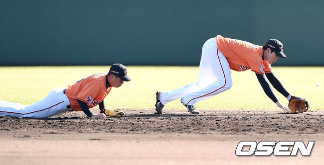 한화 이창열과 강경학이 수비 훈련을 하고 있다.