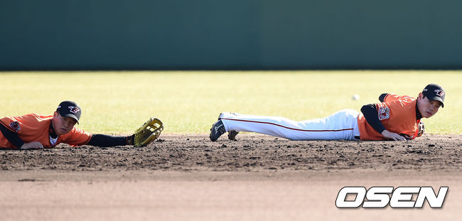 한화 이창열과 강경학이 수비 훈련을 하고 있다.