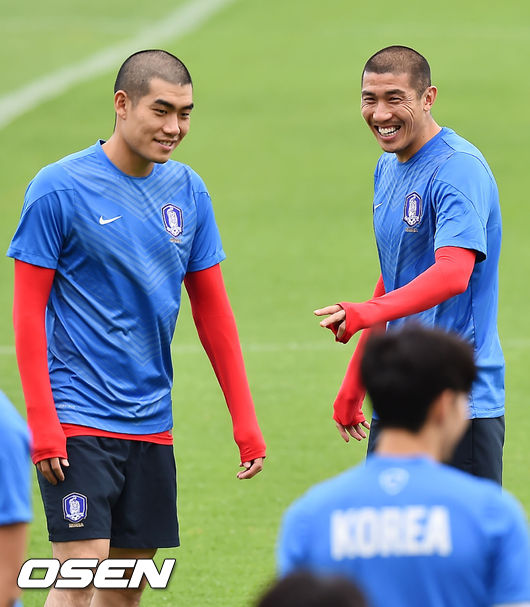 울리 슈틸리케 감독이 이끄는 한국 축구대표팀이 이라크와의 2015 아시안컵 4강전에 대비해 24일 오후 호주 시드니 코가라흐 오발에서 훈련을 가졌다. 차두리와 김주영이 훈련장에서 환하게 웃고 있다.
