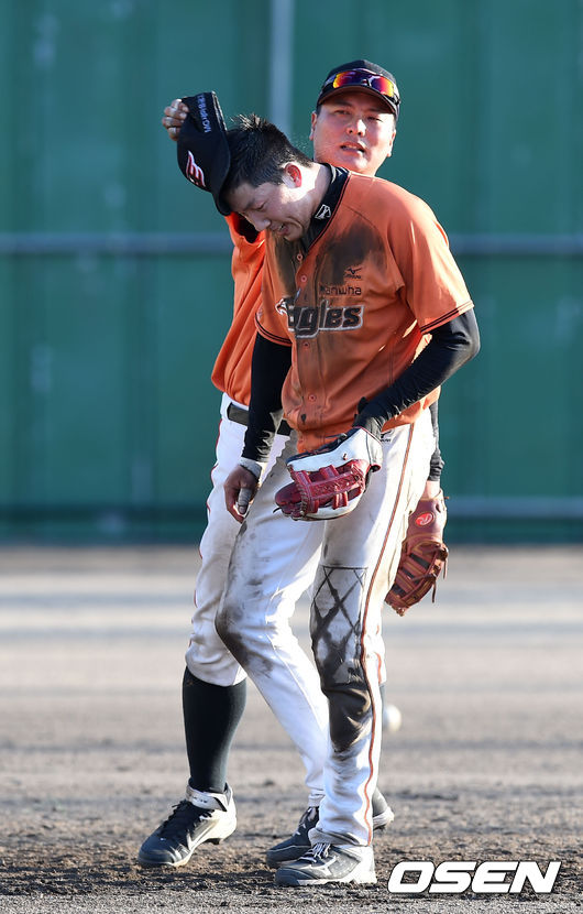 한화 김태균이 펑고 훈련 중 김회성의 모자를 벗겨주고 있다.