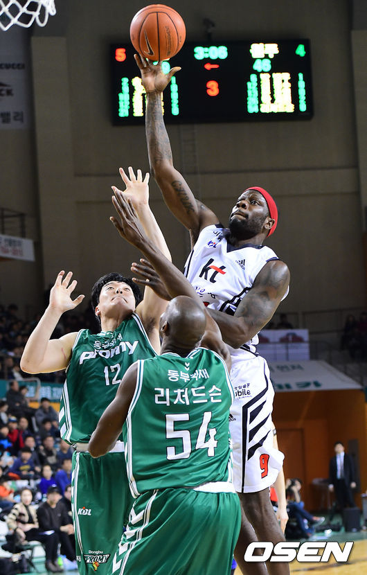 3쿼터, KT 오코사가 동부 김봉수-리처드슨의 수비를 받으며 슛을 시도하고 있다.