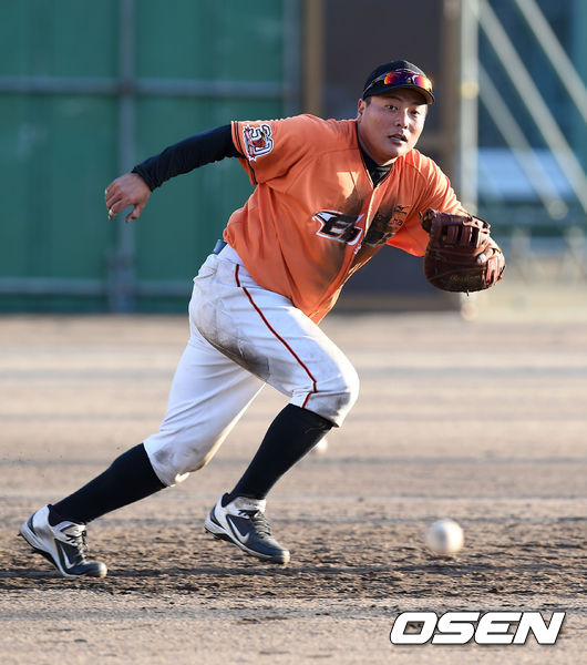 한화 김태균이 김성근 감독의 펑고를 받고 있다.