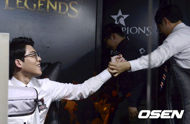 GE 의 최종스코어 2-0 승리 이후 스맵 송경호와 리 이호진이 기쁨을 나누고 있다.