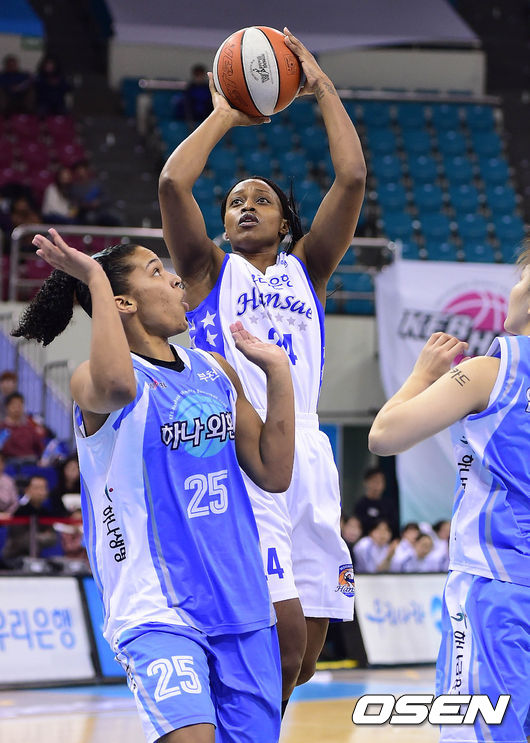 24일 오후 경기도 부천시 부천실내체육관에서 열린 'KB국민은행 2014-2015 여자프로농구' 하나외환과 우리은행의 경기 1쿼터 휴스턴이 슛을 시도하고 있다.