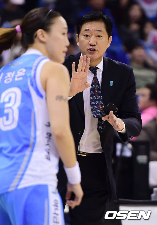 24일 오후 경기도 부천시 부천실내체육관에서 열린 'KB국민은행 2014-2015 여자프로농구' 하나외환과 우리은행의 경기 1쿼터 박종천 감독이 김정은에게 지시를 하고 있다.