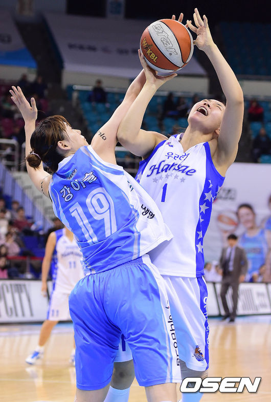 24일 오후 경기도 부천시 부천실내체육관에서 열린 'KB국민은행 2014-2015 여자프로농구' 하나외환과 우리은행의 경기 2쿼터 양지희가 슛을 시도하는 중 강이슬의 파울에 걸리고 있다.