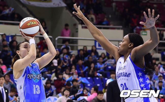 24일 오후 경기도 부천시 부천실내체육관에서 열린 'KB국민은행 2014-2015 여자프로농구' 하나외환과 우리은행의 경기 3쿼터 김정은이 슛을 시도하고 있다.