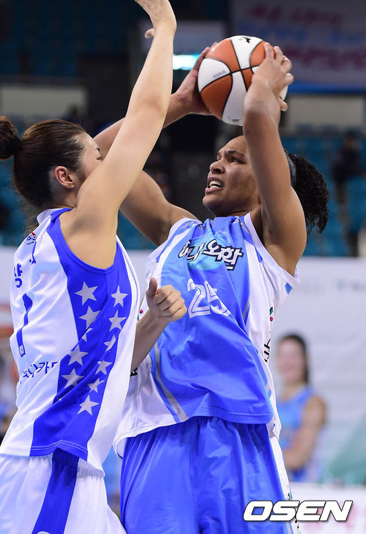 24일 오후 경기도 부천시 부천실내체육관에서 열린 'KB국민은행 2014-2015 여자프로농구' 하나외환과 우리은행의 경기 3쿼터 토마스가 슛을 시도하고 있다.