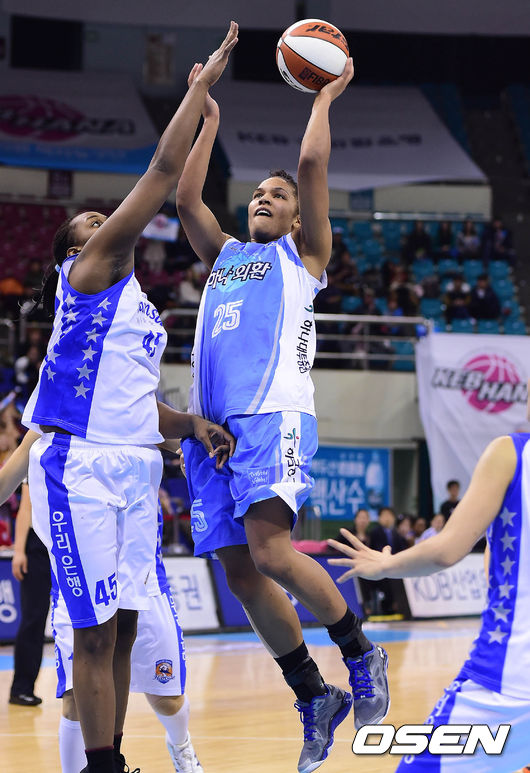 24일 오후 경기도 부천시 부천실내체육관에서 열린 'KB국민은행 2014-2015 여자프로농구' 하나외환과 우리은행의 경기 4쿼터 토마스가 슛을 시도하고 있다.