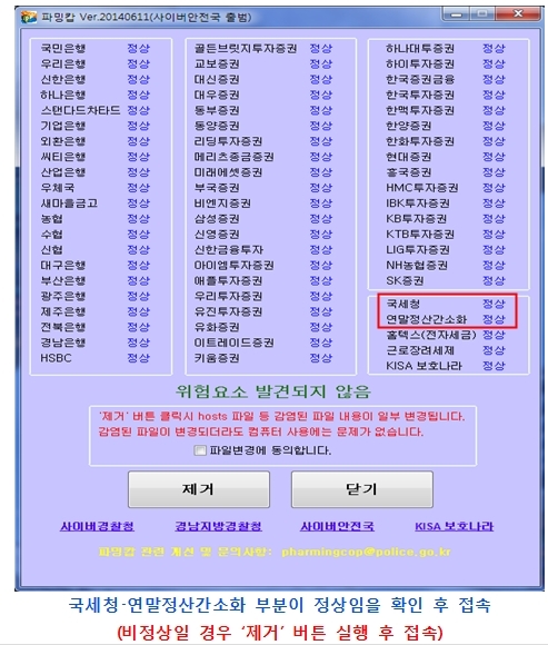 스마트폰 등 모바일 뿐만 아니라, PC를 악성코드로 감염시킨 후 가짜 ‘연말정산간소화서비스’ 사칭사이트로 유도하는 파밍 피해도 우려된다. PC가 악성코드에 감염된 경우에는 정상적인 ‘연말정산 간소화서비스’ 사이트를 입력해도 가짜 파밍사이트로 이동되어 피해 발생할 수 있다.