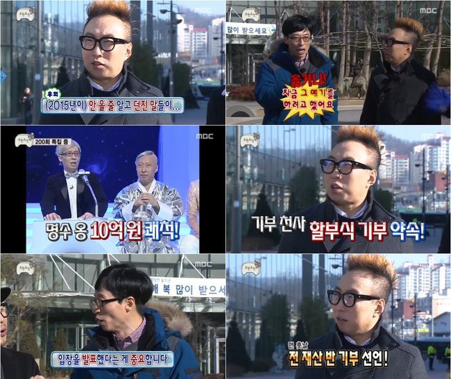 이날 박명수는 '10억 할부 기부'를 약속했다. 5년 전 방송된 200회 특집에서 내뱉은 말 때문이었다. 당시 멤버들은 가상으로 2000회 특집을 꾸몄고, 박명수는 "2015년에 10억 원을 기부했다"고 말했다. 진지한 발언도 아니었고, 꽁트의 대사 중 하나였다. 문제(?)는 어느새 시간이 흘러 2015년이 됐다는 것이었다.
