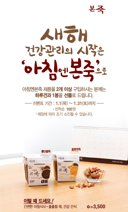 웰빙 죽 전문점 본죽(대표 김철호)은 ‘아침엔 본죽’을 2개 이상 구매하는 이에게 땅콩, 잣 등 견과류가 골고루 들어간 ‘하루견과’를 증정하는 이벤트를 진행 중이다. 전국 1200여 개 본죽 가맹점에서 오는 31일까지. 지난 달 출시한 ‘아침엔 본죽 통단팥죽·꿀호박죽’은 100% 국산 통팥과 단호박으로 만들어 아침 대용식뿐만 아니라 겨울철 건강 간식으로도 인기를 끌고 있다.