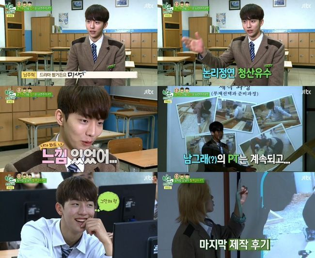 24일 오후 방송된 JTBC 예능프로그램 '학교 다녀오겠습니다' 29회에서는 지난 방송에 이어 한양공고 3편이 방송됐다. 이날 강남, 남주혁, 장기용은 정자에 대한 제작과정 PT 모습이 그려졌다.