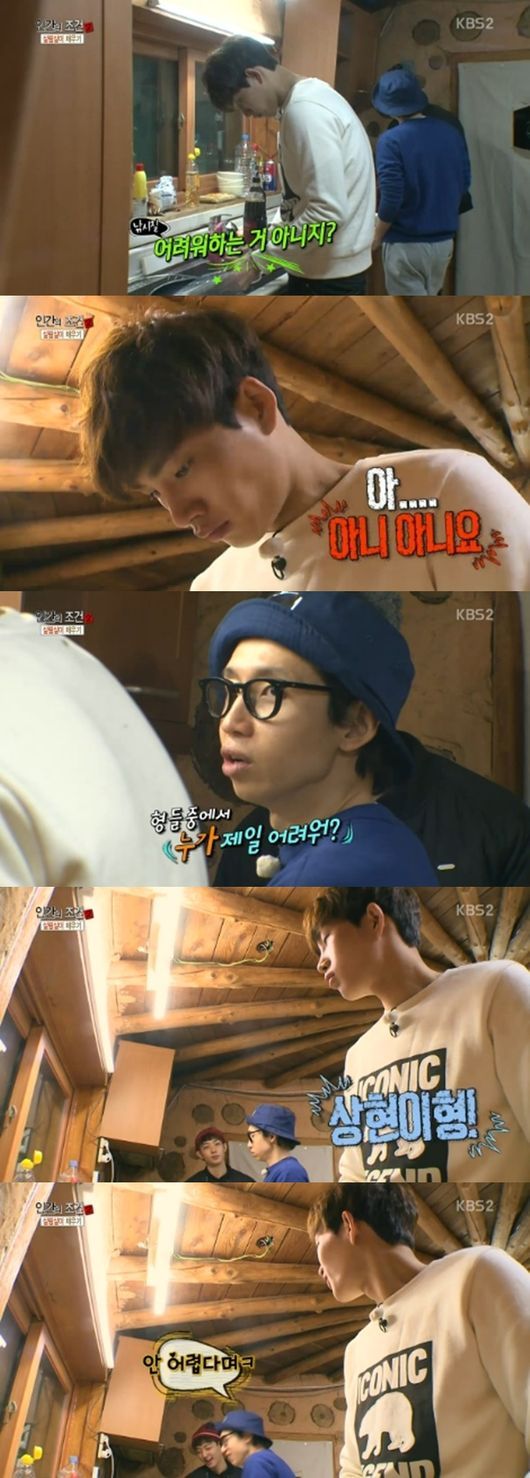 24일 방송된 KBS 2TV 예능프로그램 ‘인간의 조건2’에는 윤상현 은지원 봉태규 허태희 현우 김재영이 휴대폰 인터넷 자가용 돈 쓰레기 없이 사는 ‘오無라이프’ 두 번째 합숙을 시작하는 모습이 그려졌다.