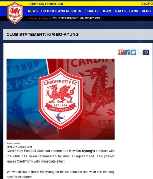 카디프 시티는 25일(한국시간) 공식 홈페이지를 통해 "김보경과의 계약이 상호합의 하에 해지되었음(contract with the club has been terminated by mutual agreement)을 알린다. 이는 즉시 효력 발생으로 김보경은 카디프 시티를 바로 떠나게 됐다"고 밝혔다.
