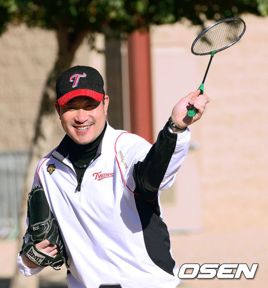 봉중근이 배드민턴 라켓으로 어깨를 풀고 있다./spjj@osen.co.kr