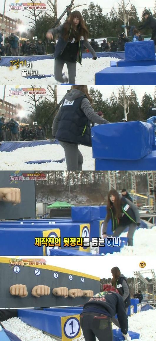 하니는 25일 오전 방송된 KBS 2TV '출발 드림팀'에서 복불복 게임 '발판아 멈추어다오' 종료 후 발판을 다시 제자리로 돌려놓으며 제작진을 도왔다.