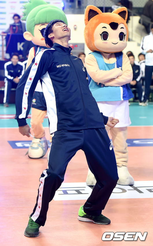 25일 오후 서울 장충체육관에서 열린 'NH농협 2014~2015 V-리그 올스타전'에서 앞서 진행된 사전행사에서 OK저축은행 송명근이 댄스를 선보이고 있다.