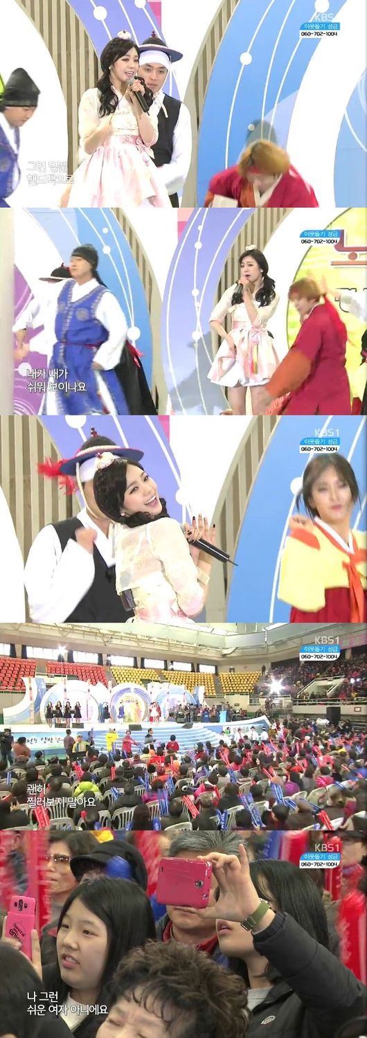 이날 댄서들과 함께 고운 한복 스타일의 무대의상을 입고 등장한 리지는 간드러지는 목소리로 노래를 불렀다. 송해의 소개를 받으며 등장한 그는 남녀노소 관객들의 뜨거운 환영을 받았다.