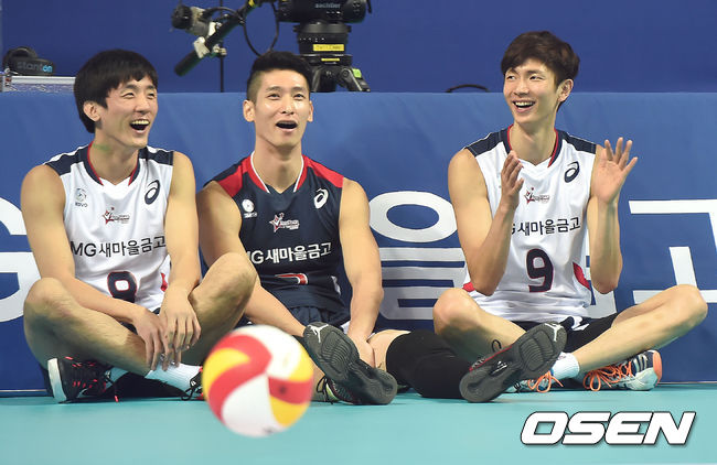 25일 오후 서울 장충체육관에서 열린 'NH농협 2014~2015 V-리그 올스타전'에 앞서 열린 스파이크 서브 콘테스트에서 곽승석, 문성민, 류윤식이 시몬의 기록에 놀란 표정을 짓고 있다.