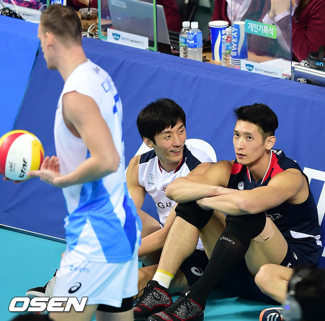 25일 오후 서울 장충체육관서 열린 NH농협 2014~2015 V-리그 올스타전 서브킹 행사에서 문성민이 용병 다비드의 서브를 지켜보고 있다.