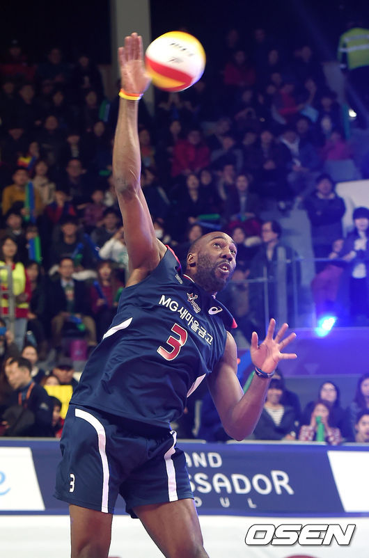 25일 오후 서울 장충체육관에서 열린 'NH농협 2014~2015 V-리그 올스타전' 스파이크 서브 콘테스트에서 서브를 하고 있다.